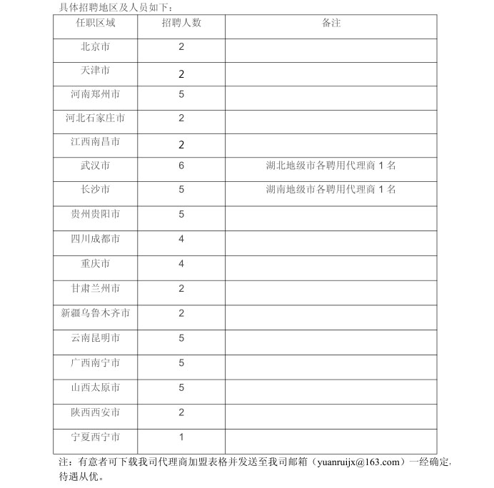 為滿足我司快速發(fā)展的銷售趨勢(shì)、開(kāi)拓新興市場(chǎng),現(xiàn)特招聘一批加盟、代理人員。